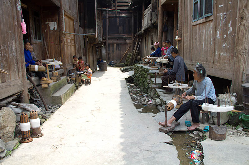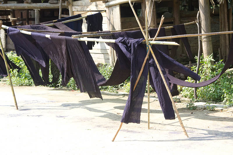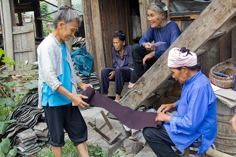 Dimen women spinning yarn, weaving and indigo-dyeing fabric