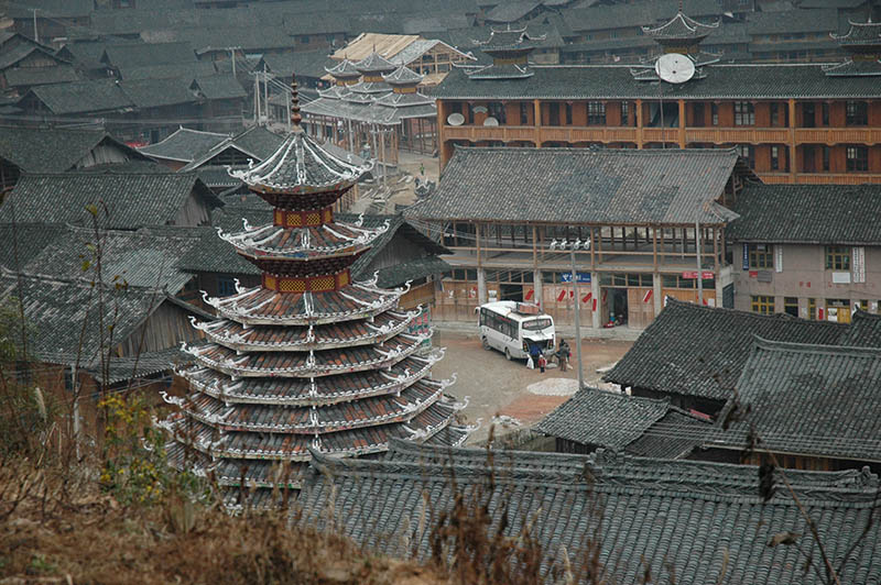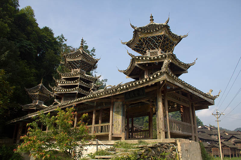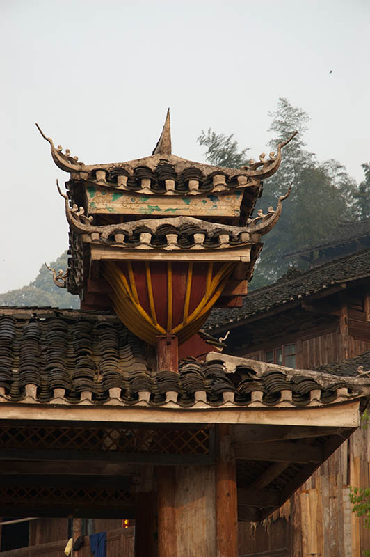 Dimen has two more drum towers that serve as meeting places for their clans. Celebrations, funerals, feasts, and other gatherings happen underneath their painted beams. Old men often smoke and discuss politics there, while children play cards and peek out from its open balustrade.