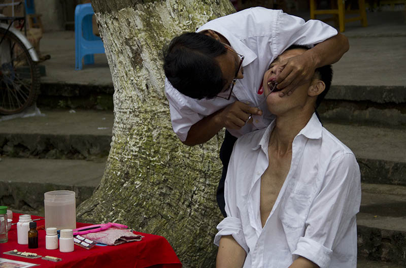 A luscious green rice field lies behind the school with a broad but shallow river curving around it from two sides. It supplies fish, irrigates plants, and serves for washing whatever needs to be cleaned whether it’s a human body, a freshly butchered pig, or a kettle darkened by years of use. Two wind-and-rain bridges dominate the scene. A small one-room clinic that treats most ailments with IV fluids is located just before the first bridge. There’s a small supply of medicine, as well, and the staff says they can set broken bones, if necessary.