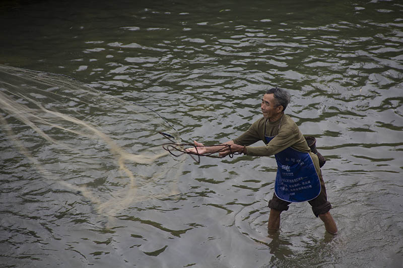 The first wind-and-rain bridge is wide enough to allow a bus to pass underneath its carved beams. Look upstream, and there’s another bridge, narrower but just as ornate as the as the first one. Just where the river bends downstream is another bridge, as narrow as the second one. Two more bridges connect the two sides of the river before the river flows past the village.