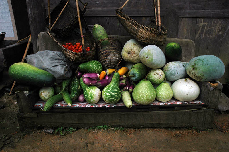 A carved entrance gate marks the village grounds high up on the main road from Maogong. Teenage girls in colorful costumes welcome village guests there with songs, decorated eggs, and rice wine. Below, Dimen rests in a lush green valley. A river winds through the middle of the village with houses lining its high banks. As the river flows on from the village, a temple, an altar to goddess Sa Sui and a bull-fighting arena define Dimen’s farthest edge. A cemetery demarks the original grounds of the village before it spread to the other riverbank. Rice fields lie farther down the stream.