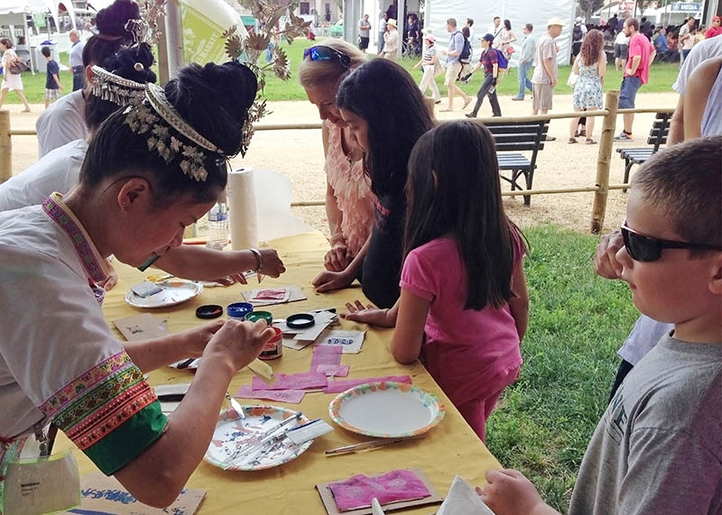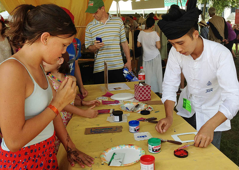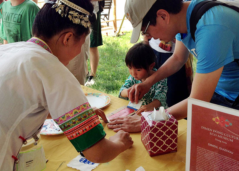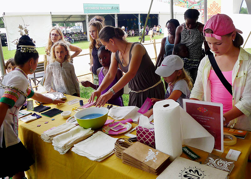 Marie Lee set up a screen-printing station where the public could print Dimen motifs on handmade mulberry paper from the village. The artisans soon took Lee’s place, and speaking their melodious Kam language and using simple gestures, enchanted hundreds of visitors with their art. Doing an activity together transcended language and broke cultural barriers between the participants and artisans.
